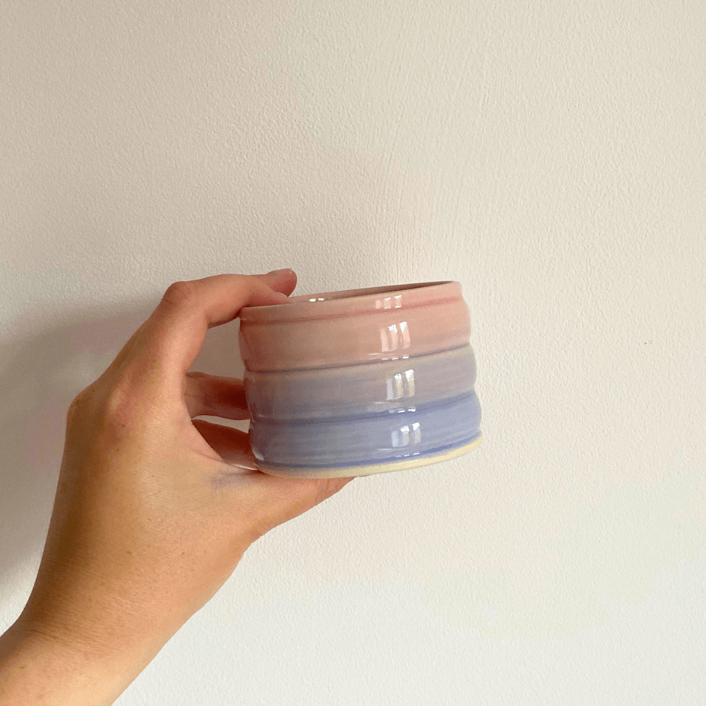 Hand-thrown ceramic cup, crafted from white stoneware clay and finished in a dreamy pink-to-purple ombré glaze. Soft, subtle tones blend beautifully across the surface, giving each cup a unique, cloud-like finish.