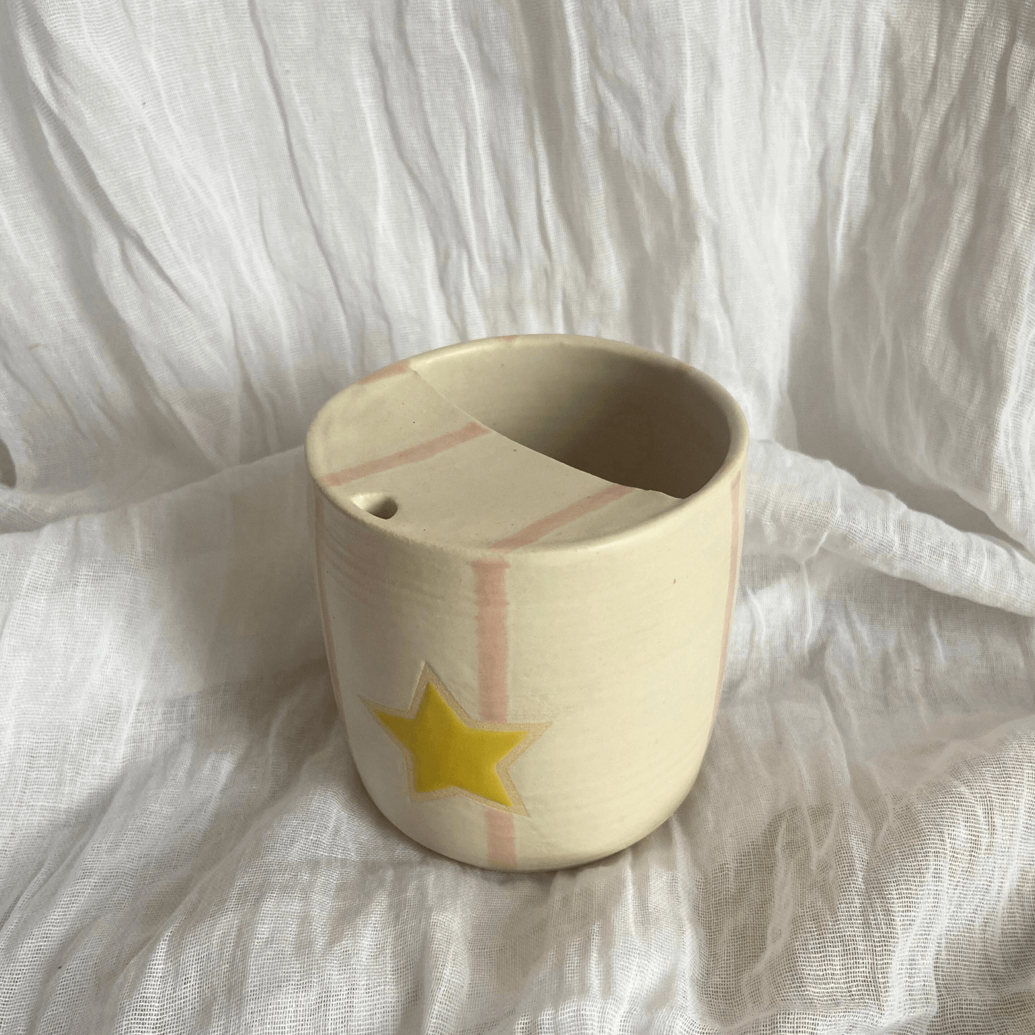 Hand-thrown ceramic travel cup, crafted from white stoneware clay and finished in a white satin glaze, with yellow and purple stars.